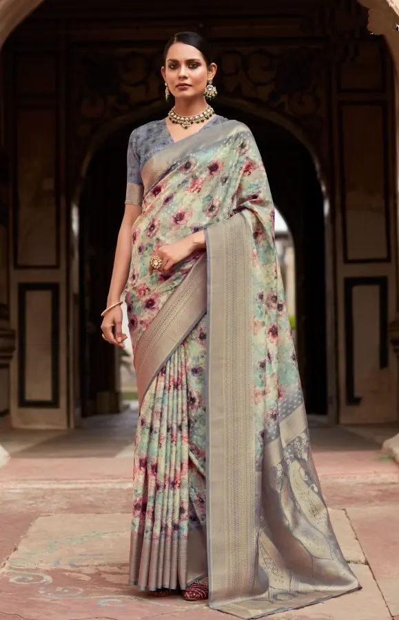Grey Banarasi Digital Printed Silk Saree